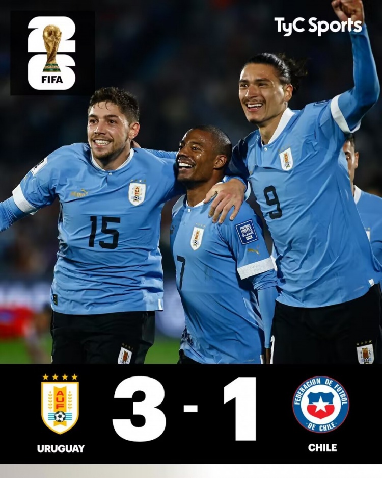 9月9日讯北京时间9月9日7时,世预赛南美赛区第一轮,乌拉圭对阵智利,上半场,努涅斯助攻德拉克鲁兹破门为乌拉圭首开纪录,补时阶段,巴尔韦德远射破门扩大比分优势;下半场,努涅斯助攻德拉克鲁兹再入一球,比达尔替补出场打入一球!全场比赛结束,乌拉圭3-1智利。