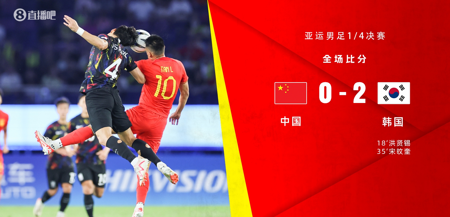 10月1日讯 亚运会男足1/4决赛,中国vs韩国,上半场,洪贤锡任意球直接破门,韩佳奇奉献神扑后失误致丢球,朱辰杰伤退,尾声阶段戴伟浚头球中柱。易边再战,双方互有攻防但均破门乏术。最终中国0-2韩国止步八强,遗憾结束本次亚运会的征程。
